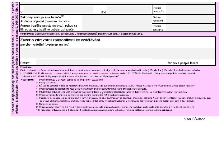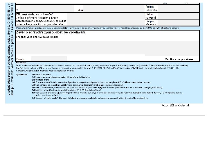 Náležitosti přihlášky: • podpis uchazeče a zákonného zástupce- nově i datum narození zákonného zástupce • místo vyplnění přihlášky – bydliště + datum • termín konání školní PZ • zdravotní způsobilost (v př. , že ji SŠ vyžaduje)- zjistit si při dnech otevřených dveří • ověřená kopie rozsudku o OZP • Podpůrná opatření – vychází se z doporučení ŠPZ ( nepředkládá se povinně) • PO 1. stupně lze na základě žádosti uchazeče i bez doporučení ŠPZ