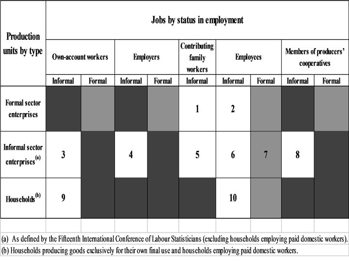 Jobs by type 1. Status in employment (ICSE-93): ownaccount workers, employers, contributing family workers, employees, and members of producers’ cooperatives. n Breakdown by status in employment: needed for definitional purposes and considered useful for analytical and policymaking purposes. n 2. Nature of job: informal vs. formal. n
