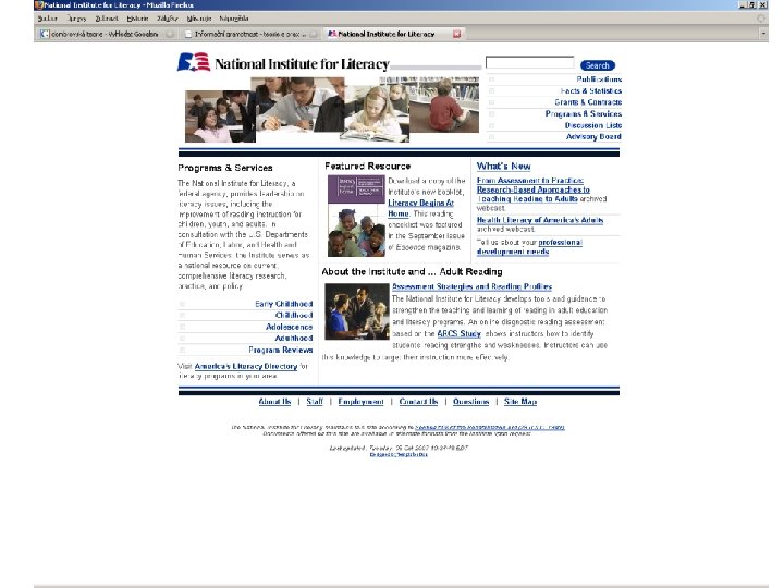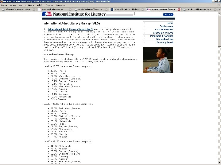 IALS, SIALS Mezinárodní výzkum funkční gramotnosti dospělých, 1994 -1998 Literární gramotnost • schopnost nalézt a porozumět informacím z textů (např. texty v novinách – úvodníky, komentáře, eseje, texty v časopisech, publikacích apod. ). • Umět si vybrat z textu podstatné, porozumět těmto informacím a umět s nimi správným způsobem nakládat. • umět vytvářet srozumitelné texty a další informační zdroje Dokumentová gramotnost • schopnost vyhledat a porozumět informacím obsaženým v konkrétním dokumentu • schopnost na tyto informace adekvátně reagovat Numerická gramotnost • schopnost pracovat s číselnými údaji • schopnost aplikovat ve správném pořadí matematické operace • schopnost tyto údaje a výsledky provedených operací správně interpretovat