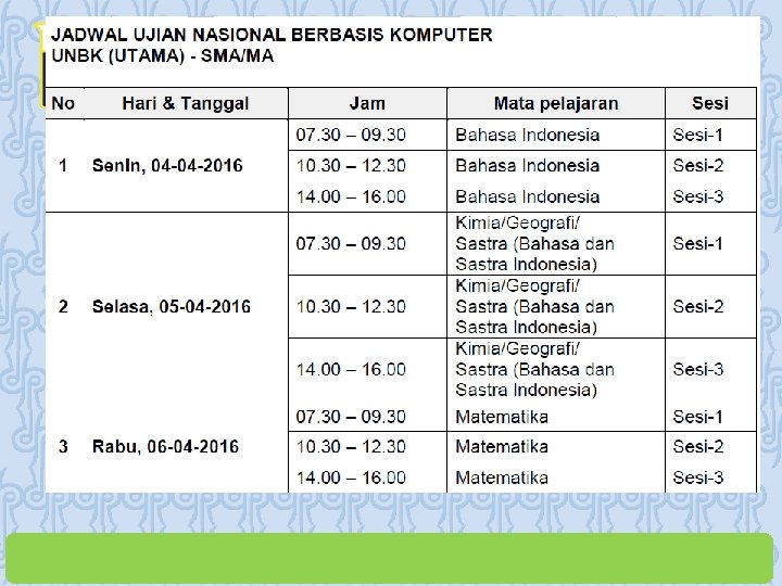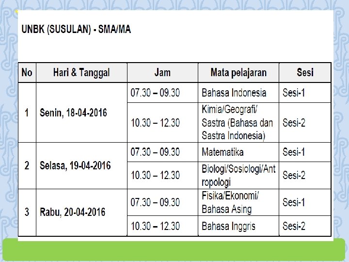 JADWAL UJIAN SEKOLAH TERTULIS UTAMA SMA TAHUN 2016 HARI, TANGGAL WAKTU SENIN, 7 MARET 2016 SELASA, 8 MARET 2016 KAMIS, 10 MARET 2016 JUM'AT 11 MARET 2016 SENIN, 15 MARET 2016 SELASA, 16 MARET 2016 RABU, 17 MARET 2016 MATA PELAJARAN/ PEMINATAN/JURUSAN IPA IPS BAHASA 07. 30 -09. 30 Pendidikan Agama 10. 00 - 12. 00 Matematika 07. 30 -09. 30 Sejarah Indonesia/ Sejarah 10. 00 - 12. 00 Bahasa Indonesia 07. 30 -09. 30 PPKn 10. 00 - 12. 00 Biologi Geografi Bahasa Asing 07. 00 -09. 00 Bahasa Inggris 09. 30 - 11. 30 Fisika Ekonomi Antropologi 07. 30 -09. 30 Penjas Orkes 10. 00 - 12. 00 Kimia Sosiologi Bahasa dan Sastra Indonesia 07. 30 -09. 30 Prakarya/ Keterampilan 10. 00 - 12. 00 Matematika Peminatan Sejarah Peminatan Bahasa dan Sastra Inggris 07. 30 -09. 30 Lintas Minat/ TIK
