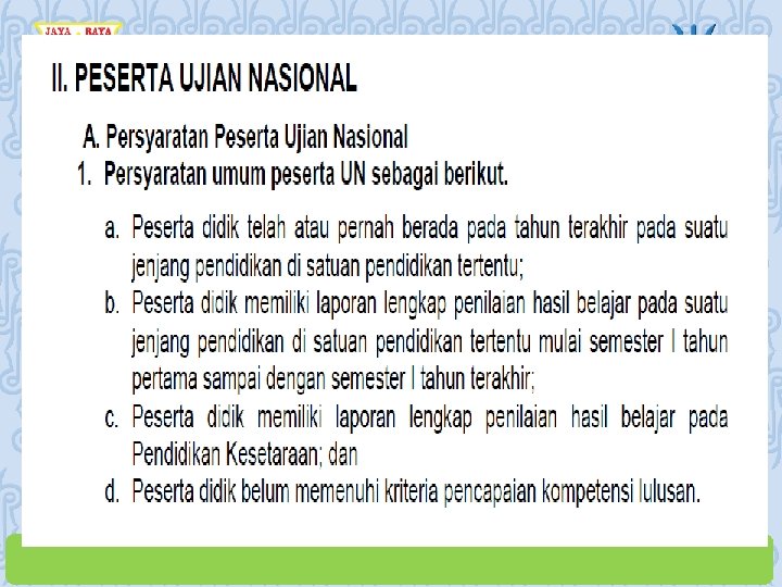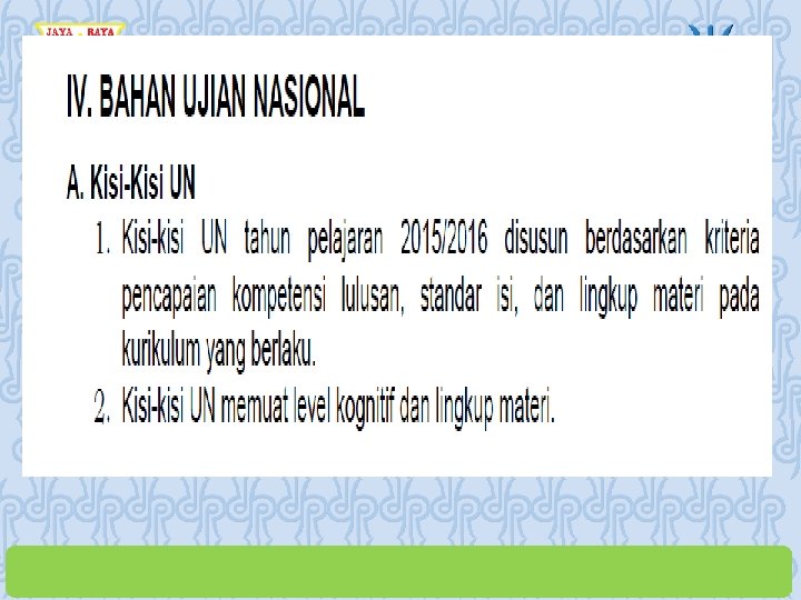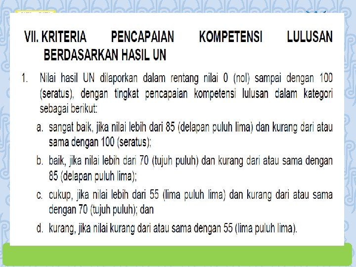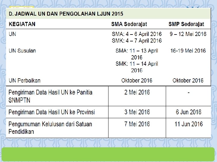 UJIAN NASIONAL 2016 1. UN Bukan Penentu Kelulusan siswa dari satuan pendidikan 2. Kelulusan Siswa dari satuan pendidikan ditentukan oleh masing-masing satuan pendidikan 3. Setiap siswa wajib mengikuti UN MINIMAL satu kali. 4. UN dapat ditempuh untuk perbaikan pencapaian terhadap standar 5. Setiap peserta UN akan menerima SKHUN 6. Katagorisasi hasil UN: a. Sangat Baik (85 < N ≤ 100) b. Baik (70 < N ≤ 85) c. Cukup (55 ≤ N ≤ 70) d. Kurang (0 ≤ N < 55) 7. Siswa yang belum mencapai kompetensi lulusan ( Kurang, 0 ≤ N < 55) dapat mengikuti UN Perbaikan 8. Indikasi tingkat kejujuran dalam UN