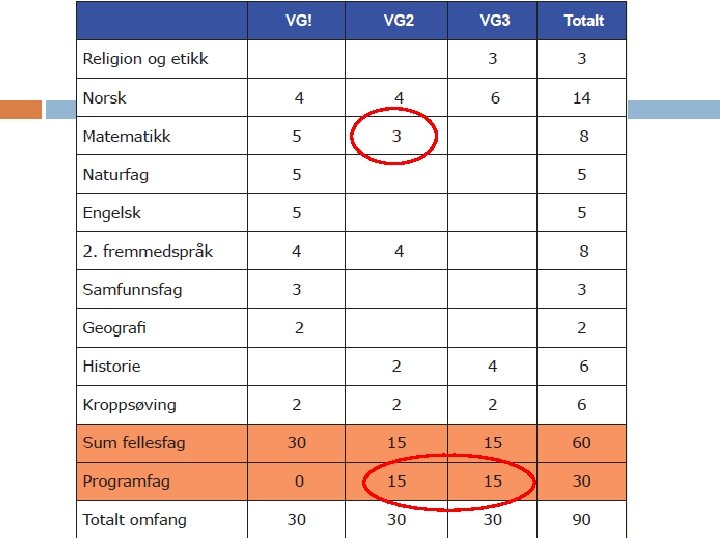 Minst 15 timer programfag hvert år og fordypning FRA VALGFRITT PROGRAMOMRÅDE ELEVENS PROGRAMOMRÅDE - FORDYNING PROGRAMFAG 1 5 TIMER PROGRAMFAG 2 5 TIMER PROGRAMFAG 4 5 TIMER VG 2 PROGRAMFAG 1 5 TIMER PROGRAMFAG 2 5 TIMER PROGRAMFAG 3 5 TIMER VG 3