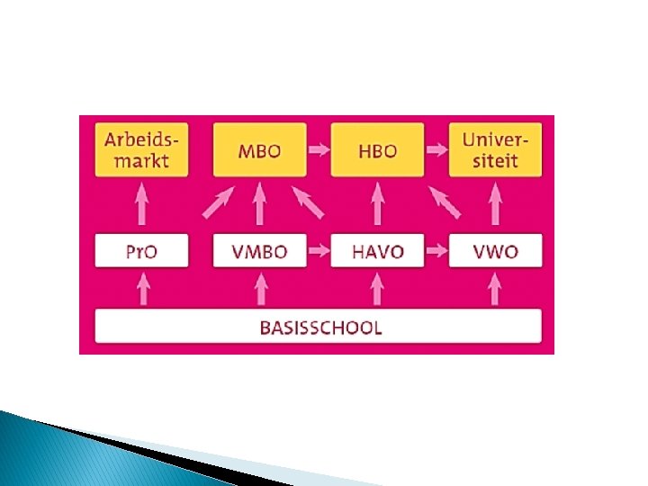 Uw kind kan het volgende advies krijgen: VMBO: voorbereidend middelbaar beroepsonderwijs. Duur: 4 jaar! VMBO: meer dan 60% van alle leerlingen gaat naar het VMBO-b: Basisberoepsgerichte leerweg (VMBO basis) De basisberoepsgerichte leerweg (VMBO basis of VMBO BB) bereidt leerlingen voor op de basisberoepsopleidingen van het MBO. VMBO-k: Bij deze leerweg krijgt de leerling algemene vakken. Het is een gerichte voorbereiding op een beroepsopleiding. De kaderberoepsgerichte leerweg (VMBO kader of VMBO KB) richt zich op de praktijk. Gemengde leerweg (VMBO GL) De gemengde leerweg (VMBO-gl of VMBO GL) ligt qua niveau dicht bij de theoretische leerweg. Met een diploma van de gemengde leerweg kunnen leerlingen ook naar het HAVO.