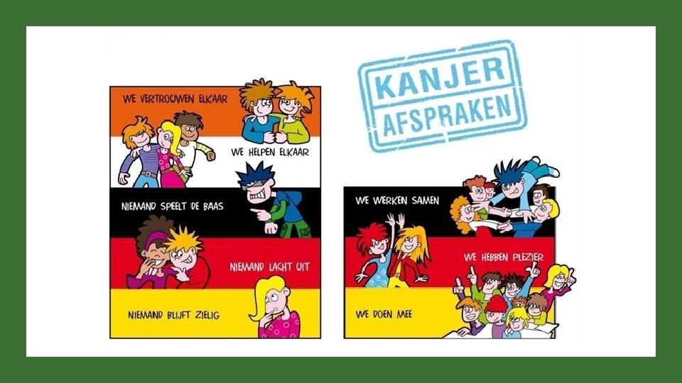 Preventie • De Kanjerafspraken • Denk goed over jezelf en de ander • Pieker niet in je uppie, maar deel je zorgen met een ander • Denk oplossingsgericht • Geef op een nette manier je mening en doe je voordeel met kritiek die je krijgt. • De school maakt onderscheid tussen onvermogen en onwil* • Hulp in de vorm van een maatje • Duidelijk schoolbeleid en handhaving ervan.
