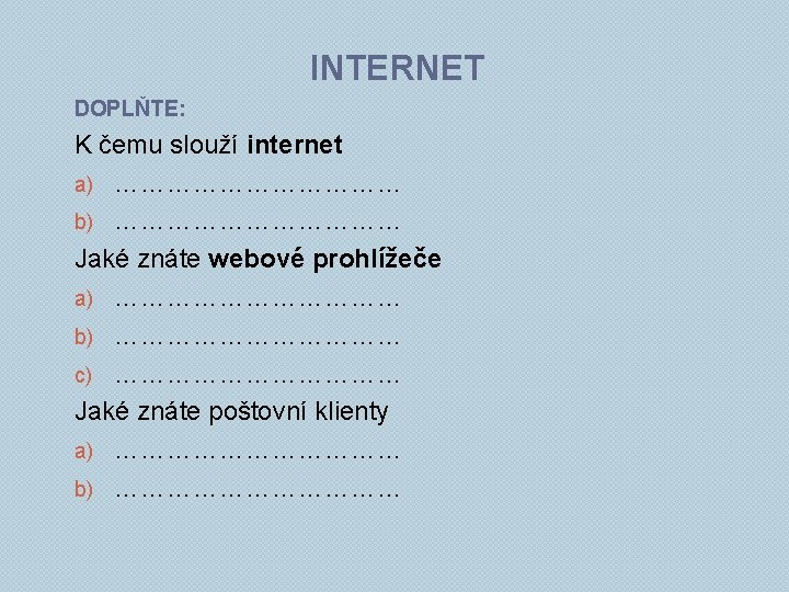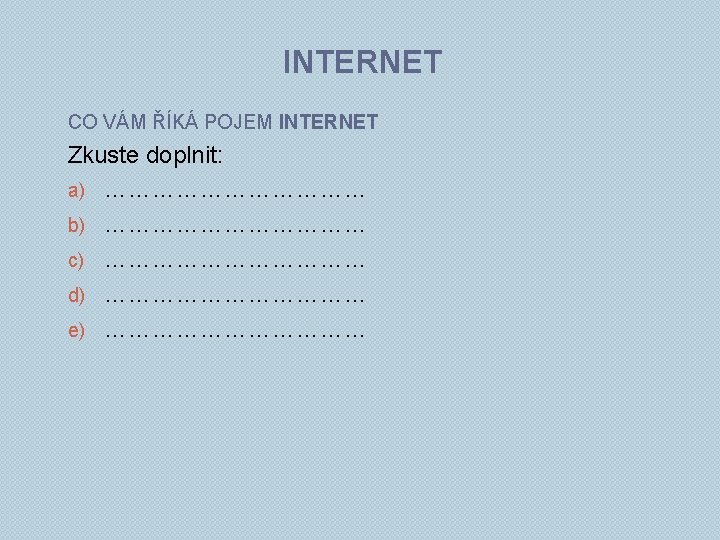 ZÁKLADNÍ SLUŽBY INTERNETU Vo. IP – telefonování pomocí Internetu FTP – přenos souborů DNS – domény – jména počítačů Umožnuje hlasovou komunikaci pomocí internetu (Skype) Slouží k ukládání a přenosu souborů na webový server, systém jmen počítačů umožňujě jejich snadnější zapamatování