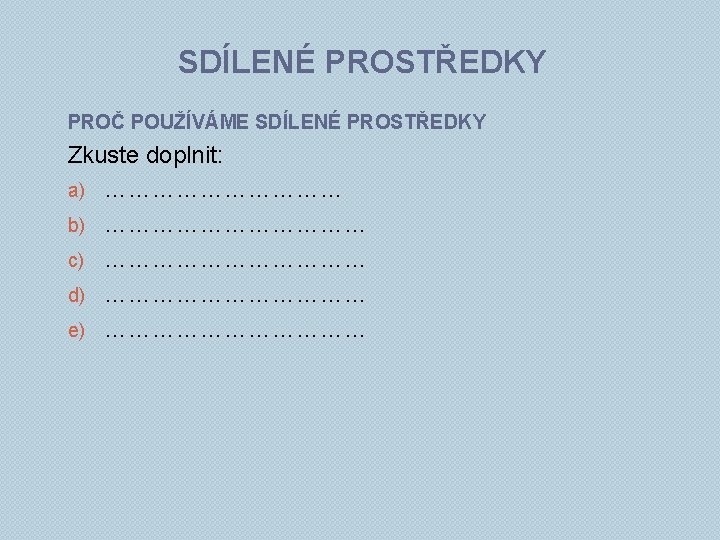 SDÍLENÉ PROSTŘEDKY DOPLŇTE: Jaký mají význam sdílené prostředky: a) ……………… b) ……………… Co můžeme sdílet a) ……………… b) ……………… c) ……………… K čemu slouží dálková správa, jaké znáte aplikace pro realizaci a) ……………… b) ………………