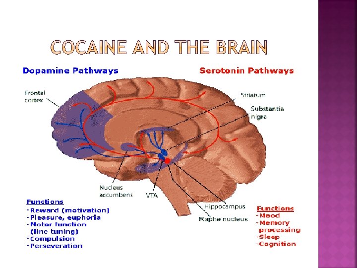 � Myth � The negative health effects are minimal. � Fact � Chronic intranasal usage can degrade the cartilage separating the nostrils (the septum), leading eventually to its complete disappearance � Myth � Cocaine is non addictive, because withdrawal symptoms are minimal. � Fact � Cocaine has powerful psychological addictive properties. It affects the mesolimbic reward pathway.