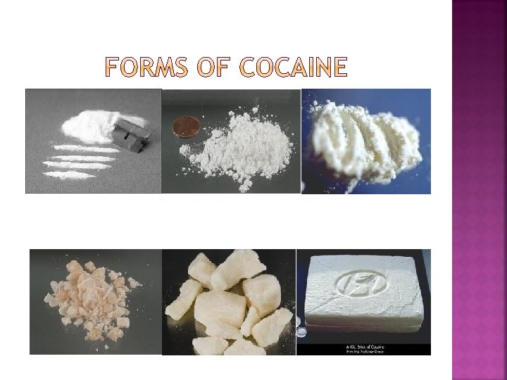 � Cocaine � Salt (powder) Form Cocaine, like many alkaloids can form many different salts, such as hydrochloride (HCl) and sulfate (-SO 4). Different salts have different solvency in solvents. Its hydrochloride, like many alkaloid hydrochloride is polar and is soluble in water. � Freebase As the name implies, “freebase” is the base form of cocaine, as opposed to the salt form. It is practically insoluble in water whereas hydrochloride salt is water soluble. Requires further processing. Freebase cocaine is smoked. Crack Cocaine-Crack is a lower purity form of free-base cocaine and contains sodium bicarbonate as impurity. Freebase and crack are often administered by smoking. The origin of the name is from the crackling sound produced when cocaine containing impurities are heated
