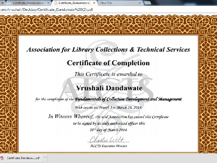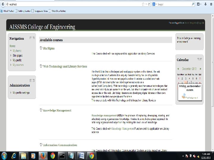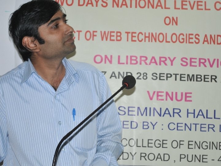 Training to librarians or patrons (researchers and students) • As a Librarian I train to both patrons of my institute and also other Library Professional. I am regularly involved in various activities like Conducting Conferences, Workshops, Book Talks, and Training Programs for Students and Faculty of AISSMS, We are also conducting “Author-Students Meet” events, where students can have live interaction with author of the books. • For other Library Professional we have organized conference and workshop like • Two days National Level Conference on “Impact of Web technologies and E-resources on Library Services, held at AISSMS COE Pune on 27 -28 September 2013 • National Level Conference on “Application of Six Sigma in Library Science Field” held at AISSMS COE, Pune on 30 September 2012 • One day workshop on “Drupal content management System ’’ on 5 October 2012 at Max Bhor Pune