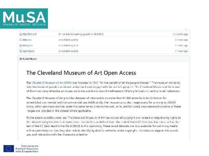 Some active museum Git. Hub accounts Museum: Tate Git. Hub link: Posted rights/license: https: //github. com/tategallery/collectio CC 0 1. 0 Universal, and requests n attribution CCo 1. 0 Universal, except for images, says to contact their R&R Carnegie Museum of Art https: //github. com/cmoa/collection Mo. MA https: //github. com/Museumof. Modern. A CCo 1. 0 Universal, except for rt/collection images, says give attribution