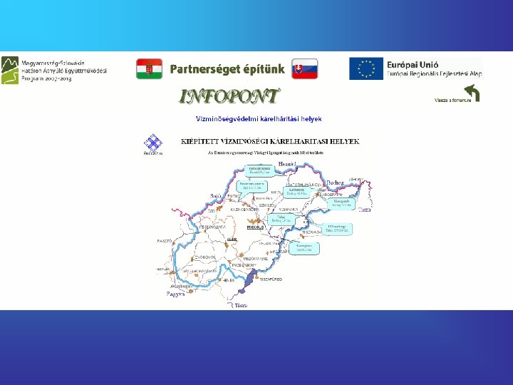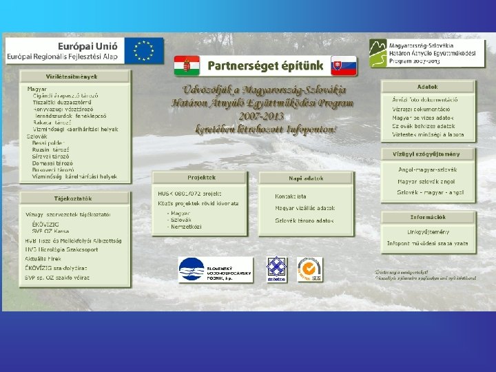 Project HUSK 0801/2. 1. 2. /0072 INFOPOINT features for information for water professionals and the community: v Continuous supply of detailed information on projects relating to cross-border waters, v Current daily information on major water facilities and structures as well as related technical documents (e. g. information on reservoirs operation), v Quality status of Water bodies in the Water Management Plant v Internet access to professional websites, v Access to a trilingual technical glossary that is continually extended and updated, v Knowing of the professional activities of partner water organisations, etc. Using INFOPOINT, both professionals and the public can have continual access to information on the work of the Tisza and Catchment Area Subcommittee of the Hungarian-Slovak Crossborder Waters Committe.