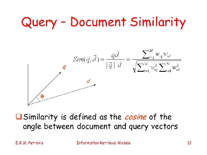 În IR interogarea utilizatorului şi documentele sunt prezentate ca vectori (seturi) de caracteristici (features) de fapt, cuvintele-cheie care apar în interogare sau în document. dj = ( t 1, j, t 2, j, t 3, j, . . . t. N, j ) qk = ( t 1, k, t 2, k, t 3, k, . . . t. N, k ) Atunci relevanţa documentului interogării se calculează ca similaritatea între document şi interogare: sim (qk, dj ) = ti, k × ti, j i=1, N