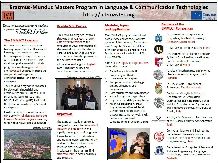 *************** To prospective Master students *************** • The Erasmus Mundus Masters Program in Language and Communication Technologies (EMMLCT) http: //lct-master. org invites applications for Erasmus-Mundus scholarships from both European and non-European students for start in fall 2016. Key facts: + duration 2 years (120 ECTS credits) + in-depth instruction in computational linguistics methods and technologies + scholarship scheme from the Erasmus Mundus Program of the European Union for EU and non-EU students + study one year each at two different partner universities in Europe + double degree + possibility to visit one of two non-European partners for a part of the study + courses and academic and administrative support in English Deadline for scholarship applications is January 10, 2016.