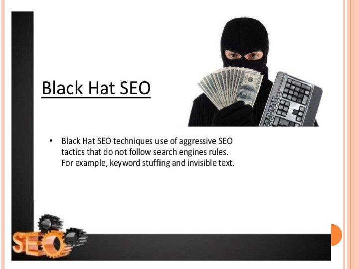 WHITE HAT SEO Ethical SEO or Organic SEO. Ranking without breaking the rules Follows SE guidlines Offering quality content and services Keywords analysis BLACK HAT SEO Unethical