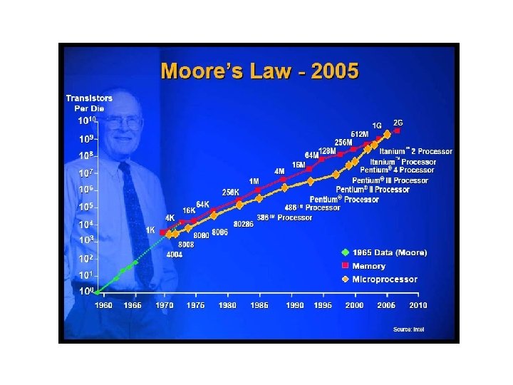 Moore’s Law • Moore’s Law is a computing term which originated around 1970 – Comes from Gordon Moore, co-founder of Intel • the number of transistors on an affordable CPU would double every two years • In other words, processor speeds, or overall processing power for computers will double every two years.