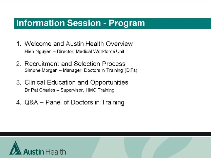 Information Session for Prospective 2017 Interns JMO Medical Education at Austin Health Assoc. Prof. Pat Charles Supervisor of HMO training Austin Health