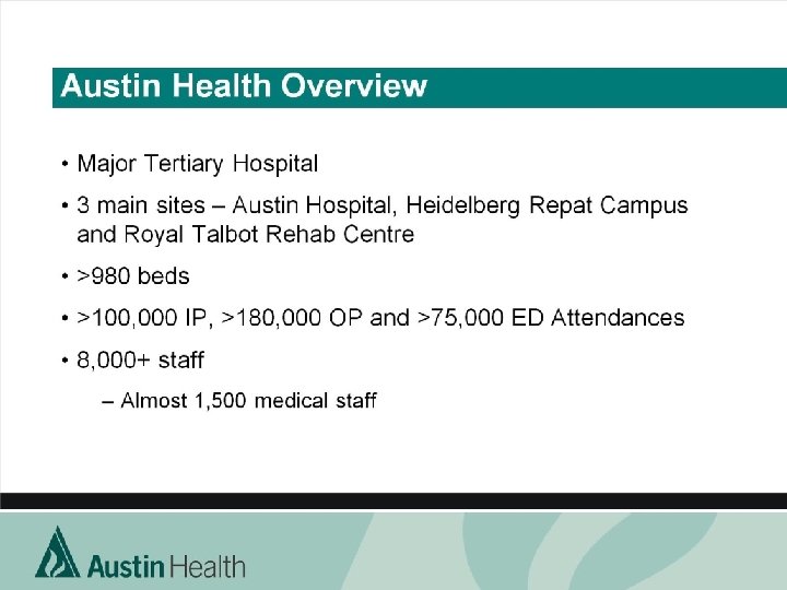 The Austin • • • Friendly and supportive environment Diversity in clinical experience and expertise Successful vocational training programs Strong research focus Excellent facilities • Good luck!