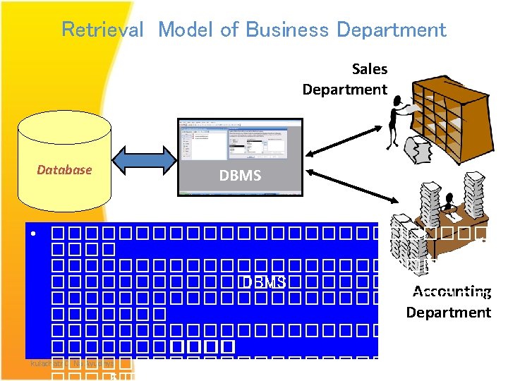Database ������������������������� ���������������� (Retrieve) �������������������� Database System Attendant Data Payroll System Payroll Slip After sale System Service Report Inventory System P/O Customer Data Suppliers Data Description Database kulachatr C. Na Ayudhya DBMS 27