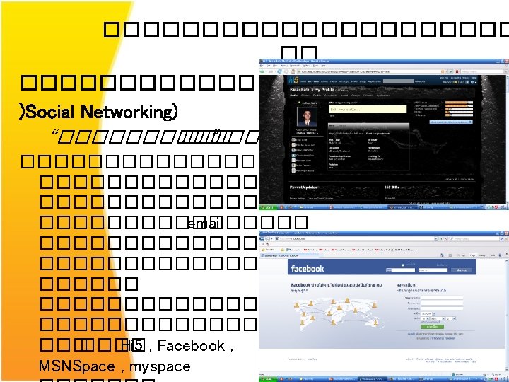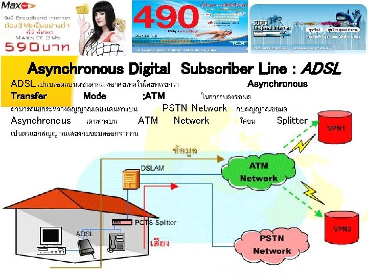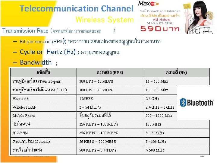 Broadband ������� "Broadband" �������������� Digital Subscriber Line (DSL ��� optic fiber) ������� "Bandwidth" ����� broadband ������ bandwidth > 1 Mbps ��������������� dial-up ������ 56 kbps ����� : Technology Learning Center. Thailand. kulachatr C. Na Ayudhya 68