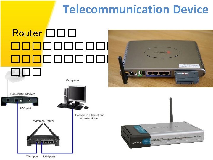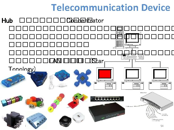 Telecommunication Device MODEM ; โมเดมคออปกรณททำหนาทแปลงส ญญาณ Digital และ Analog สลบกนเพอใหขอมลสามารถเดนทางไ ปในชองทางนำสญญาณไดอยางเหมาะสม ม 3 ลกษณะ คอ External , Internal Notebook Card Wireless และ Card Air Card EDGE , GPRS kulachatr C. Na Ayudhya LAN Internal Modem WLAN Internal Modem External Modem Splitter Card PCMCIA 53
