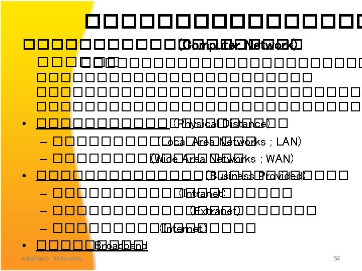 Wide Area Networks ; WAN �������� (Public Networks) �������������� (Mobile telephone networks) ��������������� 3 G-4 G ������������������ ดเพมเตมท http: //3 g. siamphone. com/articles/2009/3 g/page. htm kulachatr C. Na Ayudhya 61