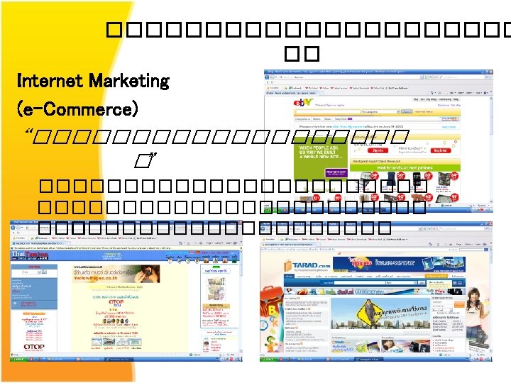 Information Technology for Communication Map for learning Module 1: Introduction to Information System and Technology Ch 1 Information System - IS Concepts - Management Information System (MIS) Ch 2 Information Technology - Hardware & Software - Telecommunications and Networking Technology Module 2 : Information Technology in Marketing Ch 3 Integrated Marketing Communication Strategy - Conceptual & IMC context - Advertising on the Internet - Google as IMC tools - Affiliate Marketing - Blog Marketing , RSS Feed … etc. Ch 4 Electronic Commerce - e-Marketing Concept - e-Commerce Development