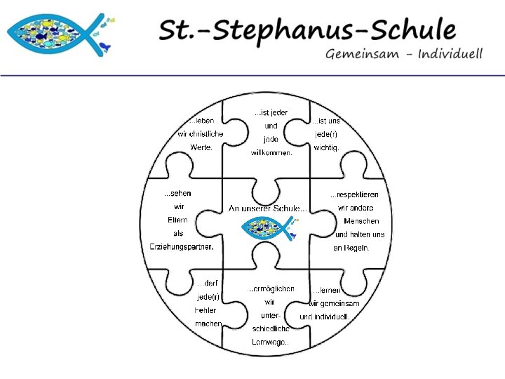 Unsere Leitziele Die individuelle Förderung ist uns ein besonderes Anliegen, denn „Jedes einzelne Kind ist uns wichtig!“- und jedes Kind ist anders. Neben all der Individualität, pflegen wir auch eine christlich geprägte Gemeinschaft: „Gemeinsam individuell“. So ist übrigens auch unser Fisch-Logo entstanden… Wir fördern ein kooperatives, offenes Lernen mit Herz, Hand und Verstand. Eine konstruktive, vertrauensvolle Zusammenarbeit zwischen Schule, OGS und Elternhaus ist für uns die Basis unserer täglichen Arbeit.