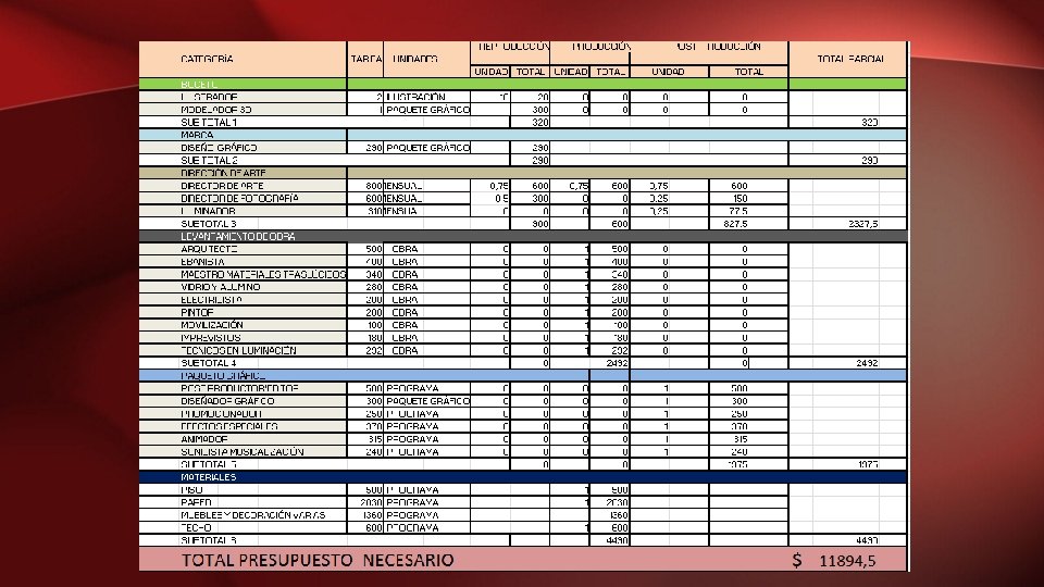 PRESUPUESTO, CRONOGRAMA Y ORGANIGRAMA Herramienta para la planificación de las actividades o de un conjunto de acciones reflejadas en cantidades monetarias. El presupuesto se encuentra dividido en tres etapas: • Pre-Producción. • Post-Producción.