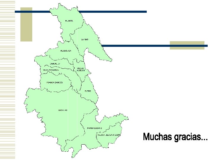 PROBLEMAS… w 45. 4 % de la población en extrema pobreza. w 33 % de tasa de analfabetismo según condición de pobreza, con mayor incidencia en el género femenino del área rural. w Insuficiente infraestructura e implementación de servicios básicos w 43. 2 % de desnutrición infantil, frente al 25. 8 % nacional. w 70. 7 % de la población no tienen acceso a servicios de electricidad w Alto grado de desarticulación vial y déficit de mantenimiento de carreteras. w Débil integración de los espacios territoriales de las provincias del sur con las provincias del norte. w Agricultura estacional con incipiente orientación al mercado exterior, predominando la agricultura de autoconsumo y de baja productividad.
