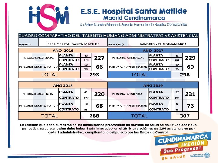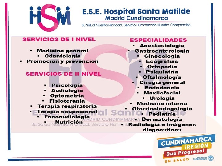 LOGROS 2016 -2019 • Aumento de la capacidad instalada en camas: 16 Adultos, 9 Pediátrica y 4 Obstétricas. • Implementación área y servicio de Sala ERA. • Mantenimiento de Infraestructura, Modernización de hotelería, Tecnología Biomédica e Informática. • Certificación SUH Sedes Madrid, Bojacá, Ocaso, Zipacón, Puente Piedra, Sosiego y El Rosal. • Reconocimiento por ocupar 1 er puesto en cumplimiento sistema obligatorio Garantía de la Calidad. • Empoderamiento Grupo de profesionales responsables de Implementación Guías de Practica Clínica. • Estandarización Procedimientos asistenciales en las diferentes sedes. • Implementación Estrategias de Capacitación continua como capsulas y rondas de Seguridad, ferias y desafíos de calidad, uso de simuladores, entre otros.