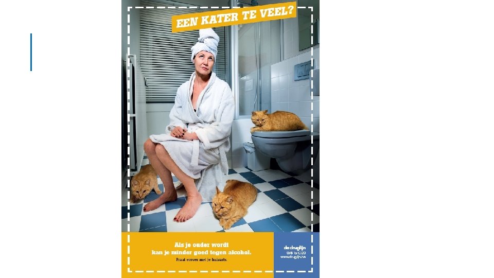 Ronde 1 Wie is het? DRINKEN HET VAAKST DAGELIJKS (B) Mannen tussen 65 en 74 jaar Dagelijks alcohol drinken tijdens laatste 12 maanden 33% 35% 29% 30% 25% 19% 20% 15% 5% 0% 1% 0% 20% 13% 12% 10% 21% 9% 1% 11% 4% 15 -24 25 -34 35 -44 45 -54 55 -64 65 -74 mannen vrouwen 75+