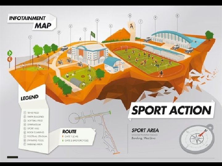Elemen Infotainment Map • • Judul Subjudul/Tagline Denah/Peta Petunjuk Arah Mata Angin Legenda Teks Keterangan (Angka, Body Teks, dll) Ikon *Tidak semua harus ada