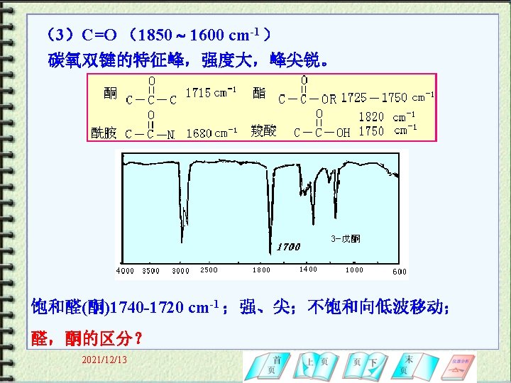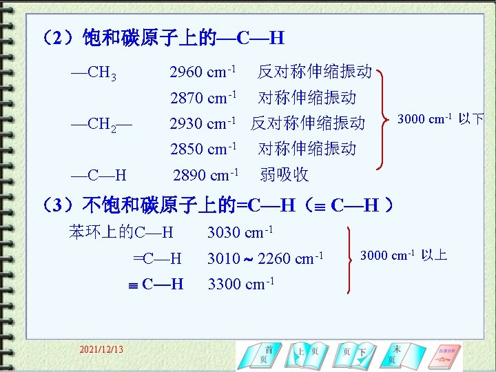 (2)空间效应:场效应;空间位阻;环张力 C H 3060 -3030 cm-1 1576 cm-1 1611 cm -1 1644 cm 2021/12/13 -1 2900 -2800 cm-1 C H 2 1781 cm -1 1678 cm -1 1657 cm -1 1651 cm -1