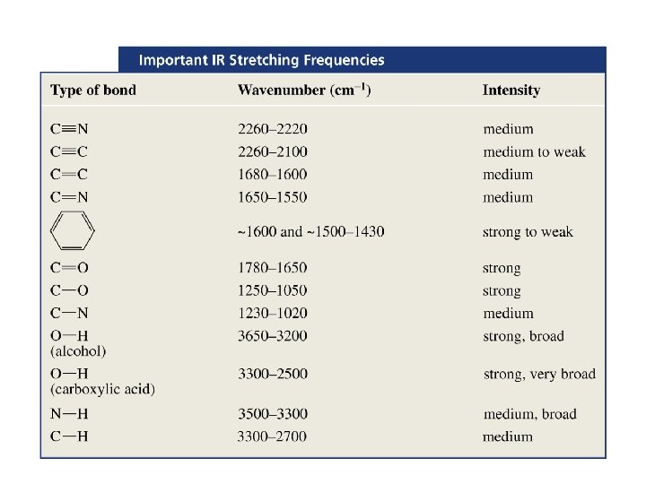 Infrared Absorption Frequencies Structural unit Frequency, cm-1 Stretching vibrations (multiple bonds) C C 1620 -1680 —C C— 2100 -2200 —C N 2240 -2280