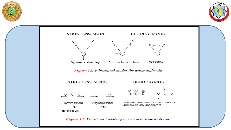 Number of vibrational modes Ø A molecule can vibrate in many ways, and each way is called a vibrational mode. Ø In order for a vibrational mode in a sample to be "IR active", it must be associated with changes in the dipole moment. A permanent dipole is not necessary, as the rule requires only a change in dipole moment. Ø For molecules with N number of atoms, q Linear molecules have 3 N – 5 degrees of vibrational modes, q Nonlinear molecules have 3 N – 6 degrees of vibrational modes (also called vibrational degrees of freedom). Symmetric Bending Asymmetric Example H 2 O, will have (3 × 3 – 6 = 3) degrees of vibrational freedom, or modes.
