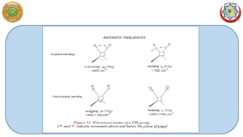 Stretching CH 2 Ø The stretching and bending modes for an AX 2 group appearing as a portion of molecule, for example, the CH 2 group in a hydrocarbon molecule. Ø Any atom joined to two other atoms will undergo comparable vibrations for example NH 2 or NO 2. Each of different vibration modes may give rise to a different absorption band so that CH 2 groups give rise to two C-H stretching bands i. e. υsym and υasym. Ø Some of the vibrations may have the same frequency i. e. they are degenerate and their absorption bands will appear at same position.