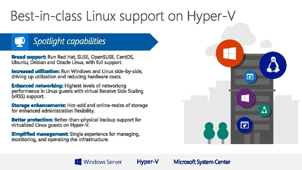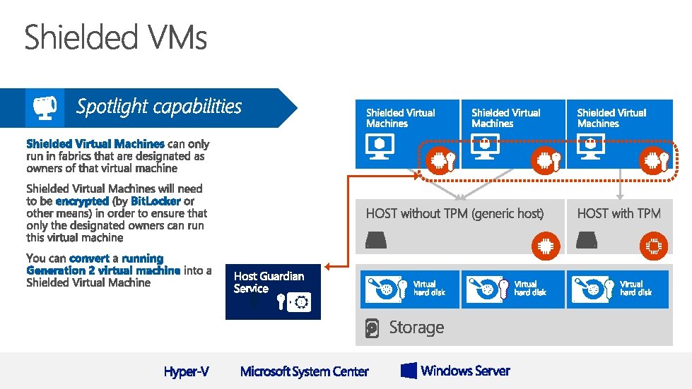 Virtual Machines Control and monitor storage performance Enabled by default for Scale Out File Server Simple out of box behavior Hyper-V Cluster Automatic metrics (normalized IOPs & latency) per VM & VHD Rate Limiters Policy per VHD, VM, Service or Tenant Define Minimum & Maximum IOPs Flexible and customizable Rate Limiters SMB 3 Storage Network Fabric Fair distribution within policy Scale-out File Server Cluster System Center VMM and Ops Manager Power. Shell built-in for Hyper-V and SOFS Management Rate Limiters Policy Manager I/O Sched