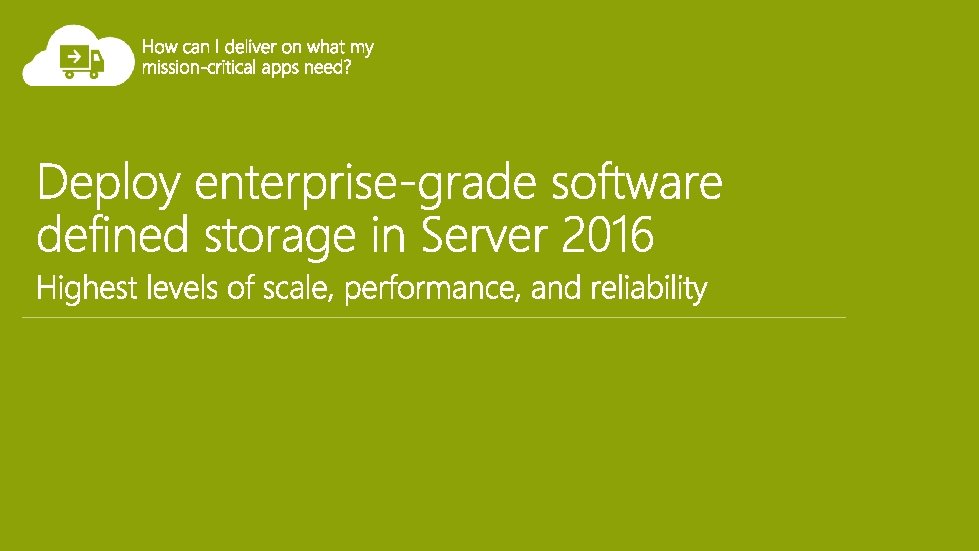 Microsoft Software-Defined Storage (SDS) 1 Performance and scalability with SMB 3 File Storage network 2 Continuous availability and seamless scale-out with Scale-Out File Server 3 Elastic, reliable, optimized with tiered storage spaces 4 Low cost standard volume hardware HYPER-V CLUSTER SMB 3 storage network fabric 1 SCALE-OUT FILE SERVER CLUSTER 2 2 System Center Primary application data storage on cost effective, continuously available, high performance SMB 3 file shares backed by tiered storage spaces 5 5 Unified storage management with System Center Today’s solution with Windows Server 2012 R 2 and System Center 2012 R 2 Storage spaces SHARED JBOD STORAGE 3 4