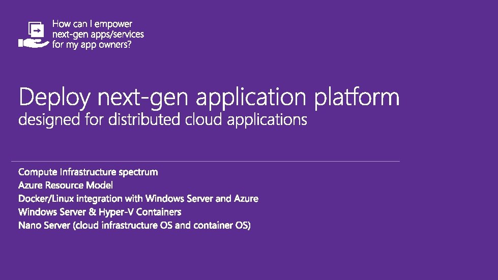 Server Core Nano Server Highly optimized Born-in-the-cloud applications Highly compatible Traditional applications