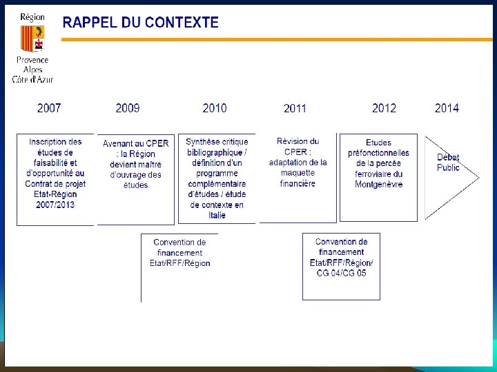 Les premières étapes (suite…) • 2009 : Lancement des études de faisabilité économique et technique en vue du débat public : - 30 octobre 2009 : Par avenant au Contrat de Projet Etat-Région (CPER), l’Etat a transféré la maîtrise d’ouvrage de ces études à la Région Provence-Alpes Côte d’Azur. Les crédits de paiement correspondants. le budget alloué pour ces études est de 20 millions d’Euros ( 5 m€ de l’Etat, 10 m€ de la région PACA, 1 M€ de R. F. F. et 4 M€ de la part des autres collectivités ) ; - Décembre 2009 : Une convention tripartite (Etat, Réseau Ferré de France (RFF) et Région) signée à l’automne 2009 fixe une première tranche d’études de 475 000 euros abondés à hauteur de 300 000 euros par la Région.