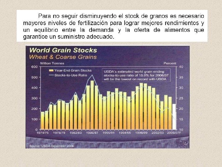 • En los dos últimos años el precio mundial del maíz y la soya se han duplicado y del trigo se ha triplicado. • Por primera vez en generaciones los precios de los comodities se están volviendo caros y continuaran así, marcando el final de una era en la que la comida era barata. • Informe de la FAO manifiesta que esto se origina en los problemas de producción de los países exportadores que mantendrán bajas, las reservas mundiales.