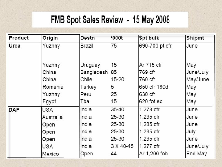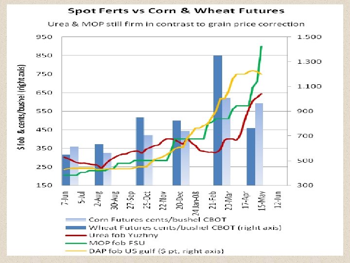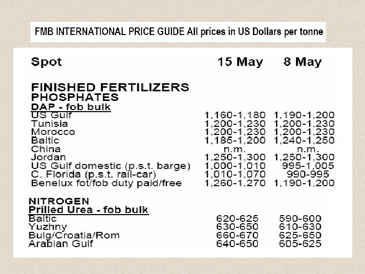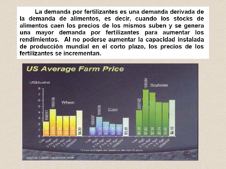 FERTILIZANTES IMPACTO EN LA AGRICULTURA PERUANA • El Perú es un país netamente importador de fertilizantes, por tanto vulnerable a las variaciones de precios y la disponibilidad de los mismos. • Los países productores de fertilizantes cumplen primero con abastecer cualquier incremento en la demanda interna, luego cumplir con los contratos establecidos con ciertos países y el restante es ofrecido al mercado mundial. • Los precios de algunos cultivos se han incrementado por ejemplo el maíz, por tanto se tendrán mas áreas de este cultivo que demandarán mas fertilizantes. • La tendencia de los cultivos de agro exportación es creciente por tanto demandante de mas fertilizantes. • Se tienen proyecciones de nuevos cultivos para producción de etanol, cultivos que demandan mas fertilizantes.