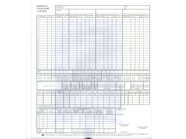 Expedice dříví k odběrateli Proces odvozu k odběrateli je nutno mít pod kontrolou: • Odvážet pouze dříví, které již bylo evidováno v číselnících včetně kontroly. • Zamezit možnostem manipulace s dodacími listy. Evidence dodacích listů, pořadová čísla – nepřetržitá řada. • Kontrolovat shodu mezi fyzickým množstvím a kvalitou expedovaného dříví a množstvím a kvalitou uvedeném v dodacím listu. • U elektronické přejímky uvádět na dodacím listu kromě změření objemu počty kusů. • Kontrolou odvozních prostředků ( seznam odběratelůaut)