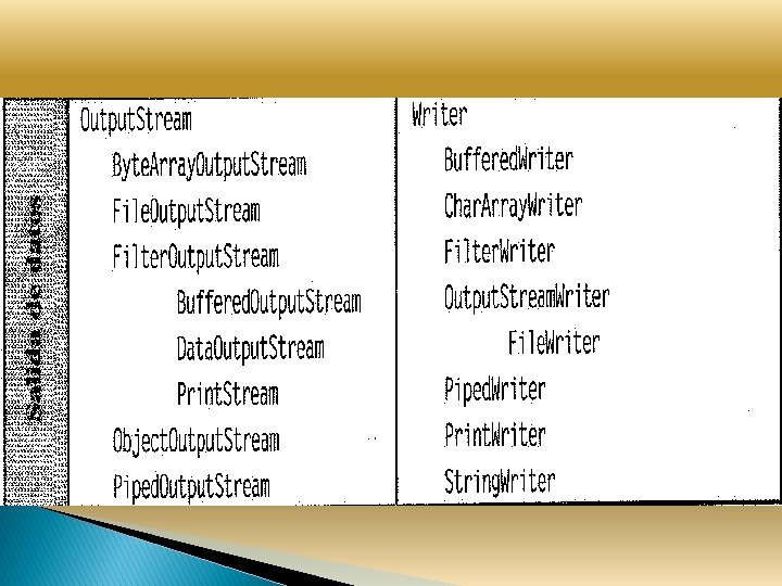 TIPOS DE FLUJOS � Existen dos tipos de flujos en Java: los que trabajan con bytes y otros que trabajan con caracteres. � Existen clases conversoras que permiten obtener un flujo de bytes a partir de uno de caracteres y viceversa, tanto para la lectura como para escritura.