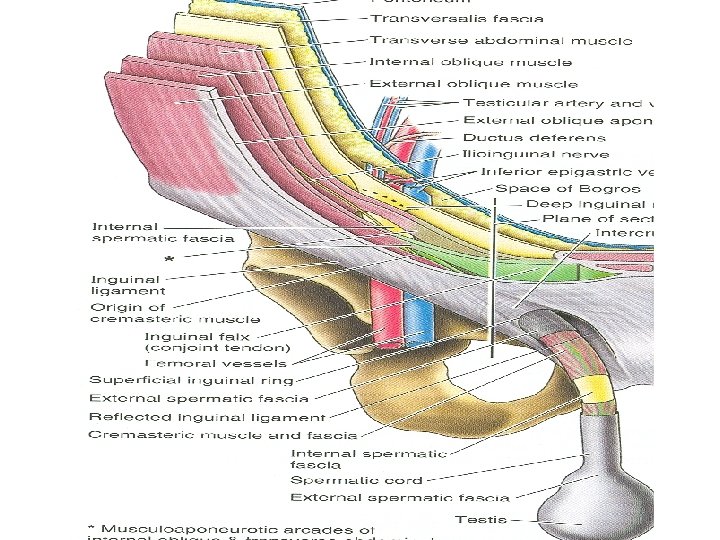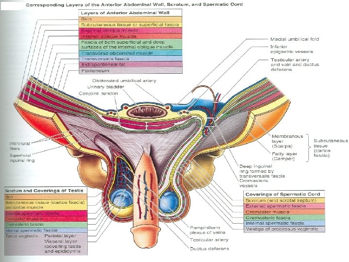 Spermatic Fasciae • Lie beneath the superficial fascia • Derived from three layers of anterior abdominal wall on each side • The external spermatic fascia is derived from external oblique • The cremastric fascia is derived from internal oblique • The internal spermatic fascia is derived from the fascia transversalis