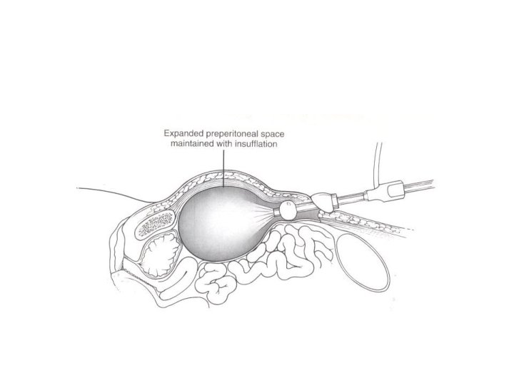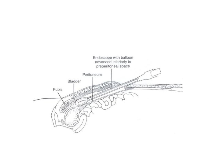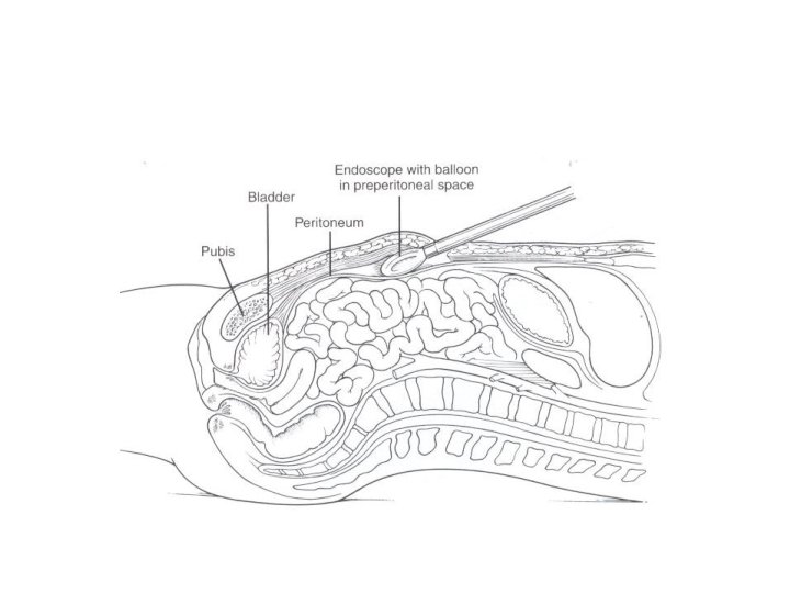 Technical difficulties • Preperitoneal space creation – Baloon dissection in early learning curve besides its cost • Peritoneal injury – Loss of exposure – Closure of defect via pretied suture, loop ligation, endoscopic stapling or endoscopic suturing • Port-site closure – Closure of fascial defects larger than 10 mm