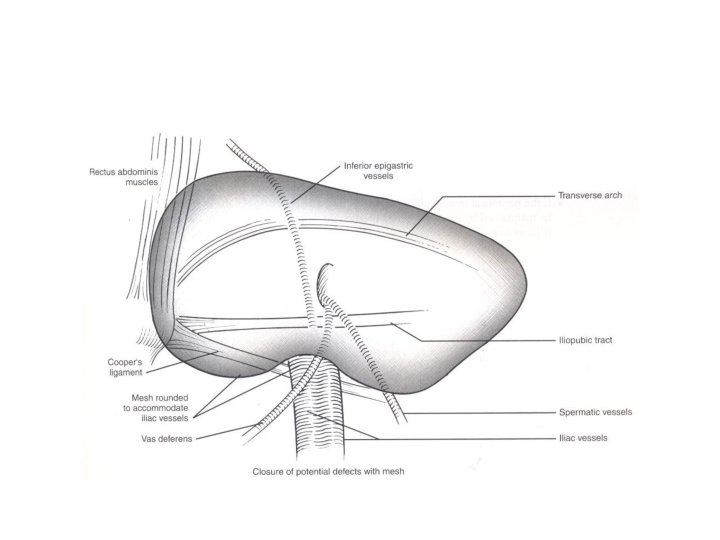 Recommendations • Larger mesh (12*17 cm) in larger hernia (>3 -4 cm) • Stapled fixation of mesh to the symphysis, Cooper’s ligament and rectus muscle in larger direct hernia (>3 -4 cm) • Overlapping of mesh approximately 1 -3 cm lateral to the spina iliaca anterior superior in large indirect hernias (>4 -5)