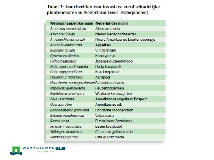 Invasieve exoten l Dit zijn exoten die zich op grote schaal in de Nederlandse natuur hebben gevestigd en economische en/of ecologische schade veroorzaken. l Vooral de ecologische schade is vaak lastig te bepalen en deels subjectief (economische schade gemakkelijker; ecologische bv. Amerikaanse rivierkreeft verdringt Europese rivierkreeft ) l Weinig exoten zijn invasief (ca. 1 op de 1000)