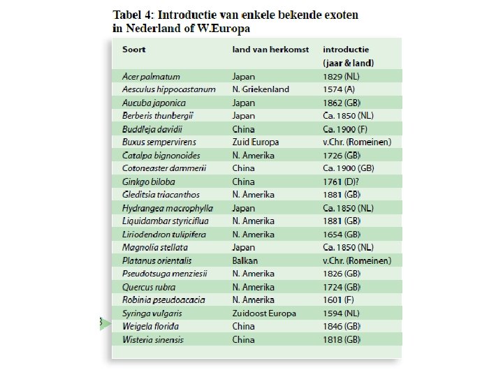 Grijze gebied tussen inheems en uitheems l Sommige soorten hebben zich niet helemaal spontaan bij ons gevestigd (bv. Beuk en Gewone esdoorn; het zijn verwilderde soorten die ingeburgerd zijn) l Sommige soorten zijn uitgestorven en daarna weer geïntroduceerd (bv. de Grove den in 19 de eeuw weer uitgezet op de Veluwe) l Inheems wordt bepaald door subjectieve/arbitraire landsgrenzen