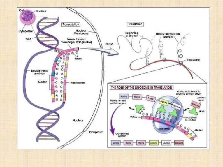 Translation • Specific amino acid on one end of each t. RNA. – anticodon on t. RNA is complementary codon on m. RNA. • m. RNA joins with a r. RNA and t. RNA – first t. RNA is released from the ribosome – Amino acids bond creating a polypeptide chain – This process is repeated until one of three stop codons is reached